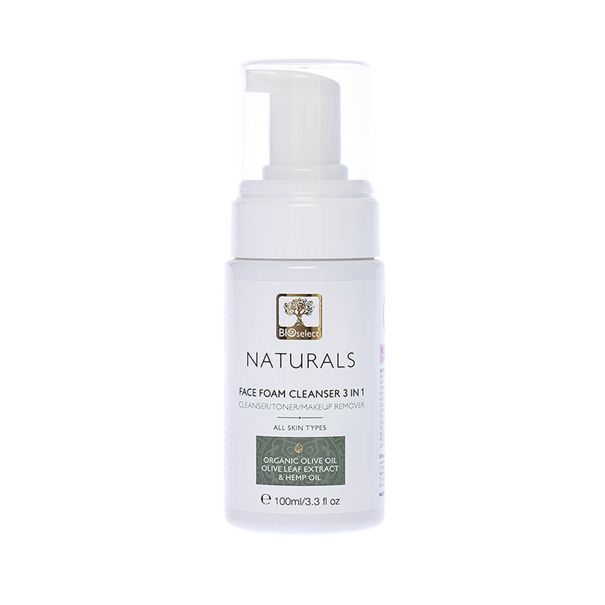 Bioselect Αφρός Καθαρισμού Προσώπου – Έλαιο Κάνναβης 3 σε 1 – 100ml. H φυσικής προέλευσης, ήπια βάση του χωρίς SLES – SLS και ερεθιστικούς παράγοντες. Καθαρίζει απαλά την επιδερμίδα από τους ρύπους και το μακιγιάζ, αφήνοντας τη απαλή και ανανεωμένη. Το ελαιόλαδο βιολογικής καλλιέργειας, το εκχύλισμα φύλλων ελιάς και το έλαιο κάνναβης, την προστατεύουν από τις ελεύθερες ρίζες και τους ερεθισμούς. Για όλους τους τύπους επιδερμίδας.