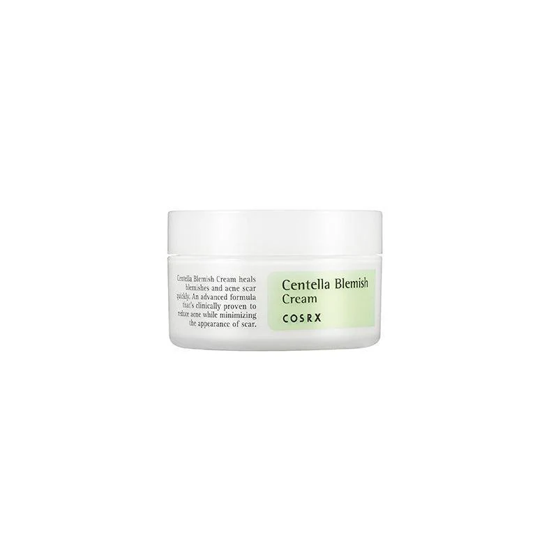 Η κρέμα COSRX Centella Blemish χρησιμοποιείται για τοπική θεραπεία και είναι κατάλληλη για όλους τους τύπους δέρματος, βοηθάει στην πρόληψη των σημαδιών ακμής, του υπερχρωματισμού, καθώς επίσης καταπραΰνει το δέρμα από την ερυθρότητα και τον ερεθισμό. Περιέχει Centella Asiatica, ένα φυσικό αντιφλεγμονώδες συστατικό με καταπραϋντικές και θεραπευτικές ιδιότητες που επανορθώνει το κατεστραμμένο δέρμα και βοηθά στην εξάλειψη των σημαδιών.