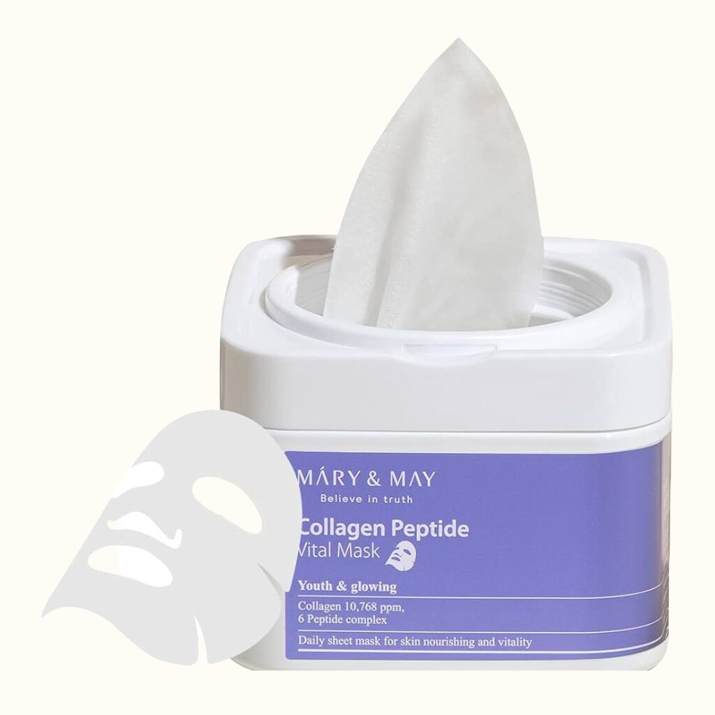 Η Mary & May Collagen Peptide Vital Mask είναι μια καθημερινή μάσκα προσώπου που συνδυάζει 10.760 ppm υδρολυμένου κολλαγόνου και έξι τύπους πεπτιδίων, προσφέροντας εντατική ενυδάτωση και ενίσχυση της ελαστικότητας του δέρματος. Κατάλληλη για όλους τους τύπους επιδερμίδας, ιδανική για την αντιμετώπιση των σημαδιών γήρανσης.