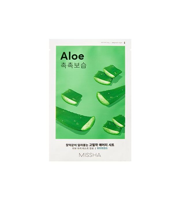 Η Missha Airy Fit Sheet Mask Aloe είναι μια ενυδατική και καταπραϋντική μάσκα προσώπου με αλόη. Προσφέρει άμεση ανακούφιση και βαθιά ενυδάτωση στο δέρμα. Εμποτισμένη με εκχύλισμα αλόης, το οποίο είναι γνωστό για τις καταπραϋντικές και ενυδατικές του ιδιότητες. Η αλόη είναι πλούσια σε βιταμίνες και μέταλλα που καταπραΰνουν την επιδερμίδα, μειώνουν τους ερεθισμούς και βοηθούν στην αποκατάσταση του δερματικού φραγμού. Τα φυσικά εκχυλίσματα που περιέχει χαρίζουν ενυδάτωση και θρέψη. Έχει τέλεια προσαρμογή στο δέρμα λόγω του λεπτού υφάσματος και επιτρέπει στα θρεπτικά συστατικά να απορροφηθούν αποτελεσματικά.