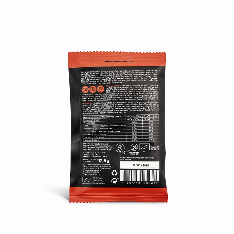 Η πρωτεΐνη Αμυγδάλου AMINO ANIMO έχει υψηλή περιεκτικότητα σε σημαντικά μεταλλικά στοιχεία, όπως Κάλιο, Μαγνήσιο, Ασβέστιο και Σίδηρο. Είναι βιολογική πρωτεΐνη υψηλής καθαρότητας πλούσια σε φυτικές ίνες. Το Αμύγδαλο είναι ένας πολύτιμος ξηρός καρπός με πολλαπλά οφέλη για την υγεία. Τα Αμύγδαλα έχουν ασυνήθιστα μεγάλες ποσότητες πρωτεΐνης και α-τοκοφερόλης σε σχέση με τους υπόλοιπους ξηρούς καρπούς. Πρόσφατες μελέτες έχουν δείξει ότι η κατανάλωση Αμυγδάλων συμβάλλει στη μείωση του ρίσκου εμφάνισης της στεφανιαίας νόσου. Η κατανάλωση Αμυγδάλων συνίσταται από την American Heart Association για την αντικατάσταση των κορεσμένων λιπαρών με ακόρεστα. Σε μια πρόσφατη μελέτη η κατανάλωση Αμυγδάλων μείωσε τους παράγοντες κινδύνου εμφάνισης της στεφανιαίας νόσου και αυτό οφείλεται στο γεγονός ότι τα Αμύγδαλα είναι πλούσια πηγή πρωτεϊνών, φυτικών ινών και λιπιδίων πλούσια σε ολεϊκό οξύ. Μελέτη έχει δείξει ότι η κατανάλωση Αμυγδάλων από υγιείς με ήπια υπερχοληστερολαιμία ενήλικες, συμβάλλει στη βελτίωση του λιπιδαιμικού προφίλ του ορού.Διατροφικά Στοιχεία
