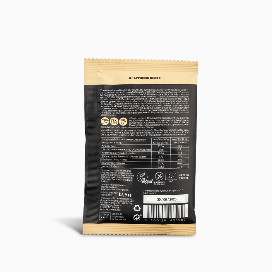 Κάθε μονοδόση (12,5γρ.) προσφέρει μία καθημερινή έκρηξη φυσικής ενέργειας από βιολογικές πρωτεΐνες αμυγδάλου, ρυζιού και ηλιόσπορου (6,6γρ.).