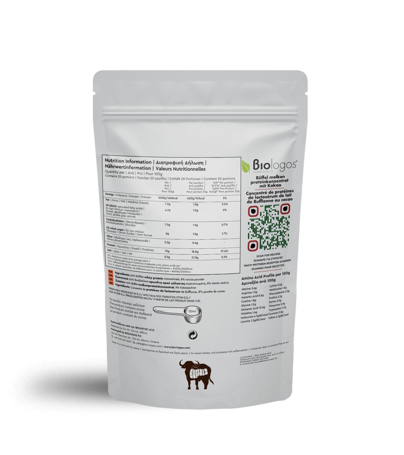Η βουβαλίσια πρωτεΐνη ορού γάλακτος Choco 75% “ΒΙΟΛΟΓΟΣ” είναι εμπλουτισμένη με ωμό βιολογικό περουβιανό κακάο, για μεγαλύτερη γευστική απόλαυση. Παράγεται από γάλα βουβαλιών που εκτρέφονται στην Ιταλία, σε φάρμες που ακολουθούν αυστηρά πρότυπα βιώσιμης κτηνοτροφίας. Τα βουβάλια ζουν σε ανοιχτούς χώρους, τρέφονται φυσικά και παράγουν γάλα εξαιρετικής ποιότητας, το οποίο είναι γνωστό για την υψηλή του θρεπτική αξία.