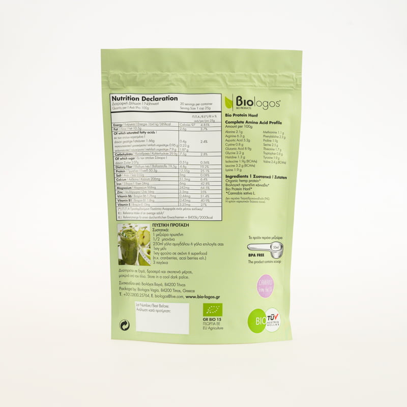Η Πρωτεΐνη Βιομηχανικής Κάνναβης «Βιολόγος» είναι μια πολύτιμη πηγή φυτικών πρωτεϊνών, μετάλλων και Ωμέγα-3 και 6 λιπαρών οξέων. Περιέχει 50% πρωτεΐνη υψηλής βιολογικής αξίας και 21 αμινοξέα, συμπεριλαμβανομένων των 9 απολύτως απαραίτητων. Επιπλέον, έχει υψηλή περιεκτικότητα σε σίδηρο και μαγνήσιο. Ιδανική για ένα δυναμικό πρωινό ξεκίνημα.
